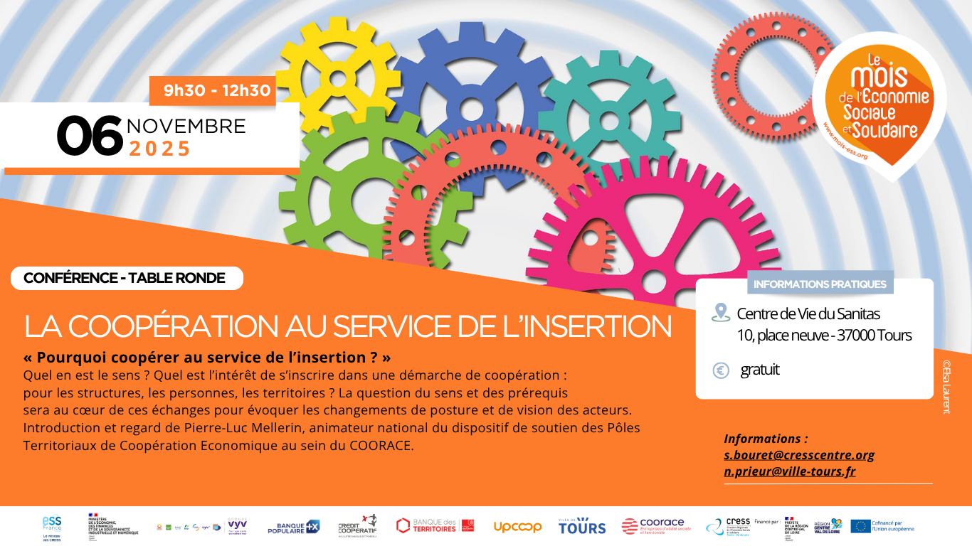 De 9H30 à 12H30 : Conférence “La coopération au service de l’insertion” (partenariat CRESS CVL et Coorace) en lien avec le mois de l’ESS.